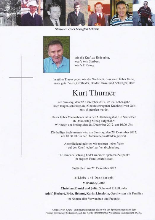 Am 22. Dez. 2012 verschied Kurt nach langer, schwerer Krankheit im 79. Lebensjahr. Der Seelengottesdienst mit anschließender Beisetzung findet am Samstag, 29. Dez. 2012, in der Pfarrkirche Saalfelden statt.